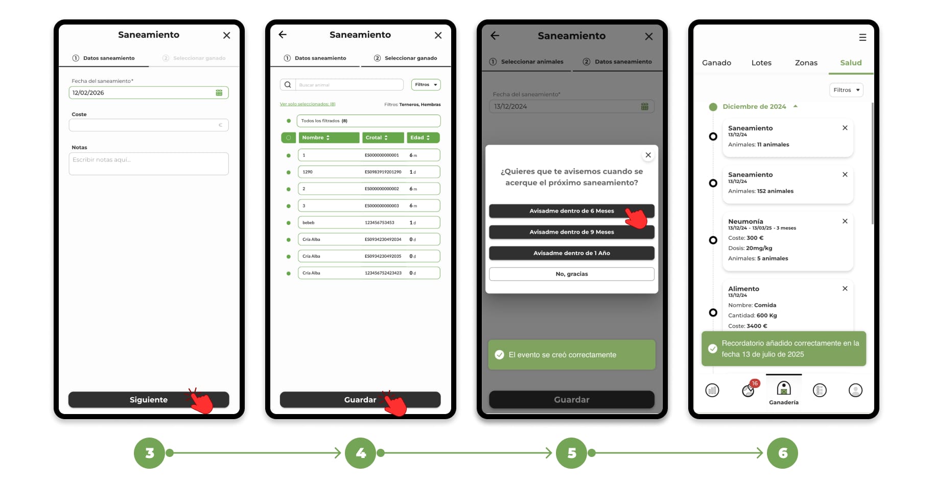 6. Al finalizar estos pasos, podrás ver el evento de saneamiento registrado en la sección "Salud".