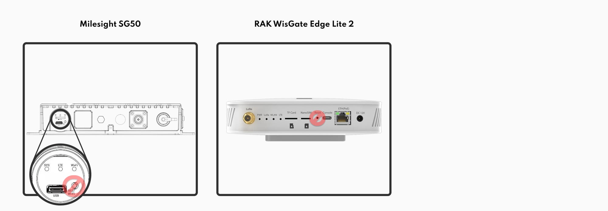 Milesight SG50 y RAK WisGate Edge Lite 2 incluyen un botón de reset.