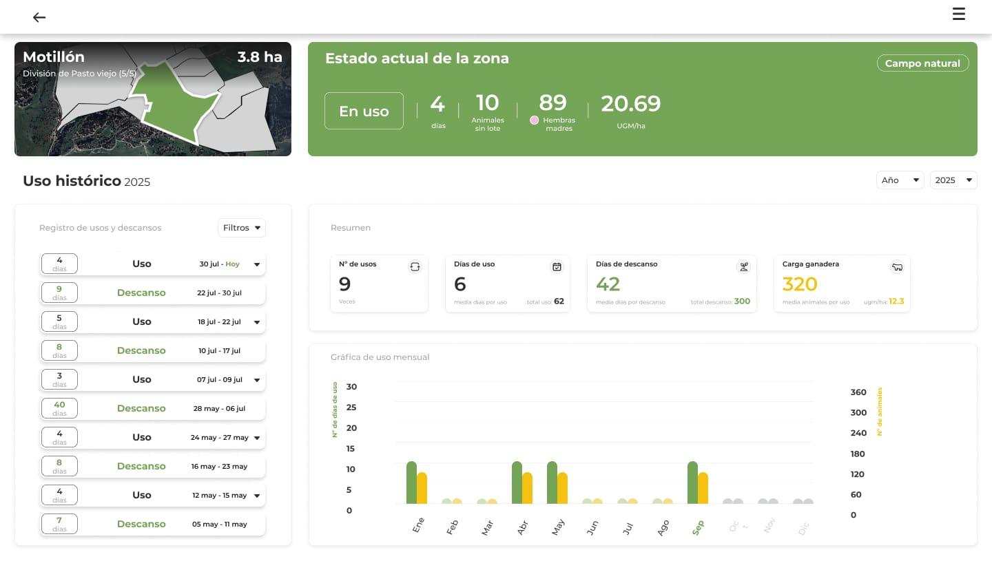Además, las estadísticas de zona se han ampliado considerablemente. Por un lado, tienes una vista anual con datos agregados: número de usos y descansos, media de animales por uso, días medios y totales de uso y descanso, y el UGM medio ponderado por duración. Por otro, una vista mensual que te permite detectar picos de carga y entender el uso global de la zona mes a mes.
