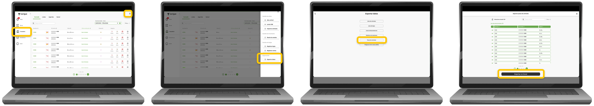 Ya puedes descargar un Excel con todos tus pesajes. Para hacerlo, ve a Ganadería → Exportar datos → Lista de pesos. Allí verás todos los animales con pesos registrados, podrás filtrarlos y seleccionar los que quieras (o todos de golpe) y al pulsar Exportar Excel tendrás el archivo listo con todos los datos.